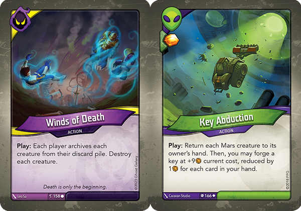 This was probably the most successful deck type to come out of Grim Reminders. The combo itself is quite simple: you cycle through your deck quickly, play Winds of Death, and archive all of your creatures—usually ten or more. Then, on the next turn, you take your archive, play Key Abduction, and get a free key. Just two cards, one is common, the other is uncommon.